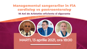 Una dintre marile provocari ale FiA este gestionarea sangerarilor. Cum abordam pacientul cu FiA si risc crescut de sangerare pentru gasirea echilibrului intre eficienta si siguranta? Controversa sangerarilor o dezbatere intre cardiolog si gastroenterolog. Va invitam in continuare alaturi de noi pentru a parcurge periplul celor 5 intalniri adresate pacientului anticoagulant. In acest al II-lea episod, vom discuta despre pacientul cu FiA si risc inalt de sangerare. Este sangerarea o temere sau un semnal de alarma? Ce facem cu pacientul cu risc de sangerare? Cum il anticoagulam? Pentru cat timp? Va asteptam in data de 13 Aprilie, orele 18:00, sa gasim impreuna cele mai bune solutii pentru acesti bolnavi. » Mai mult